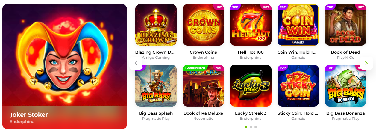 1. Automaty do gier: Największa kategoria w kasynie, obejmująca klasyczne, standardowe i niestandardowe sloty. Popularne tytuły to między innymi: Big Bass Bonanza, Joker Stoker, Dark Wolf.